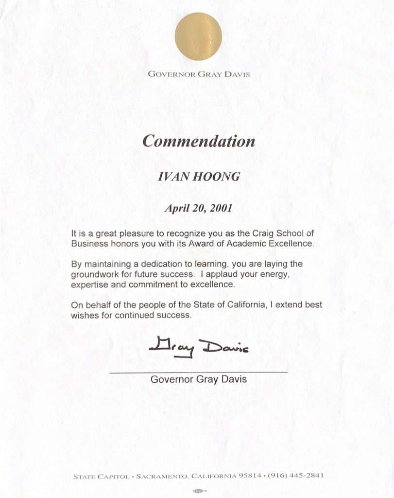 Commendation Letter from California Governor Gray Davis